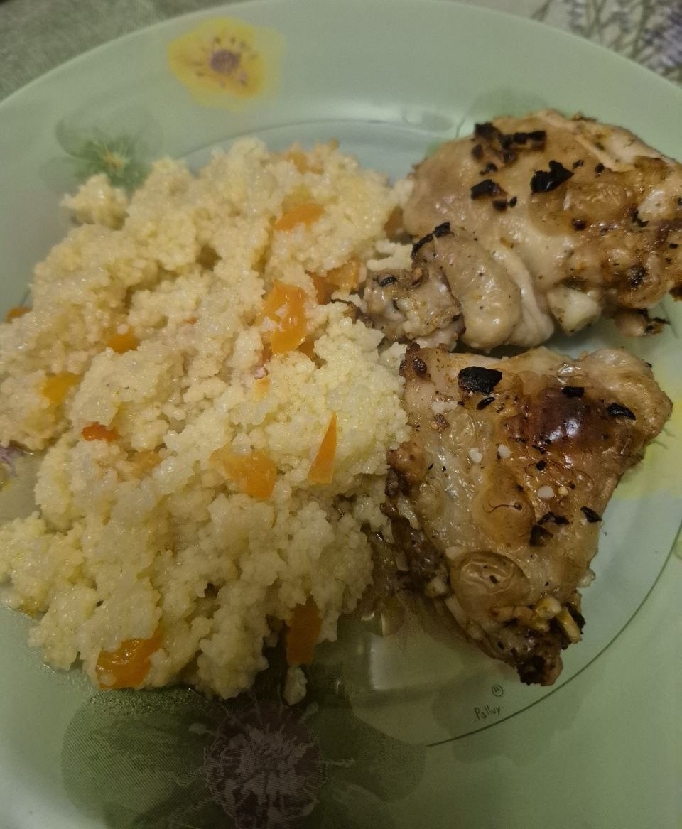 Перец режем мелким кубиком и обжариваем на сковороде до полуготовности. Смешиваем с кускусом. Отделяем от окорочков филе, режем на три части. Чеснок мелко режем, отправляем в куриное филе. Солим, перчим, добавляем иные приправы по вкусу (паприка, имбирь), немного растительного масла. Все перемешиваем. Оставляем на полчаса. Кускус укладываем в форму для запекания, сверху укладываем куриное филе, отправляем в духовку при 180 градусах. Запекаем до золотистой корочки курицы. Вынимаем. Наш вкусный ужин готов. Приятного аппетита!