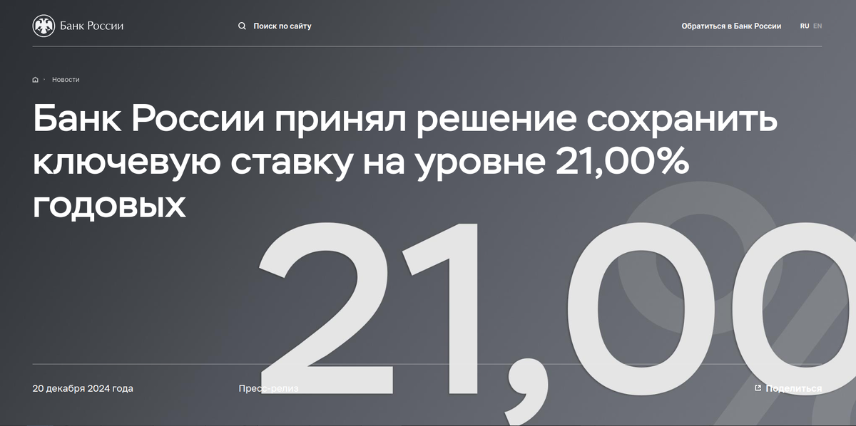 20 декабря 2024 года Совет директоров Банка России принял решение, вызвавшее положительнуюреакцию на финансовых рынках: ключевая ставка осталась неизменной на уровне 21% годовых. Рынок отреагировал бурно: индекс Мосбиржи прибавил 5,17%, достигнув отметки 2541,63 пункта. Сейчас показатель немного скорректировался до 2 539,32. Это может означать только то, что инвесторы восприняли решение ЦБ как сигнал перехода к стабильности. Однако, позитивная динамика индекса Мосбиржи – это лишь краткосрочная реакция. Понятно, что Банк России сохранил ставку благодаря усилившемуся давлению на него со всех сторон — и бизнеса, и депутатского корпуса, и правительства. Долгосрочный эффект решения ЦБ будет зависеть от эффективности борьбы с инфляцией. А ситуация с инфляцией остается напряженной. По данным Министерства экономического развития, годовая инфляция с 10 по 16 декабря ускорилась до 9,52%, что значительно выше целевого показателя Банка России. Данные Росстата подтверждают эту тенденцию: недельная