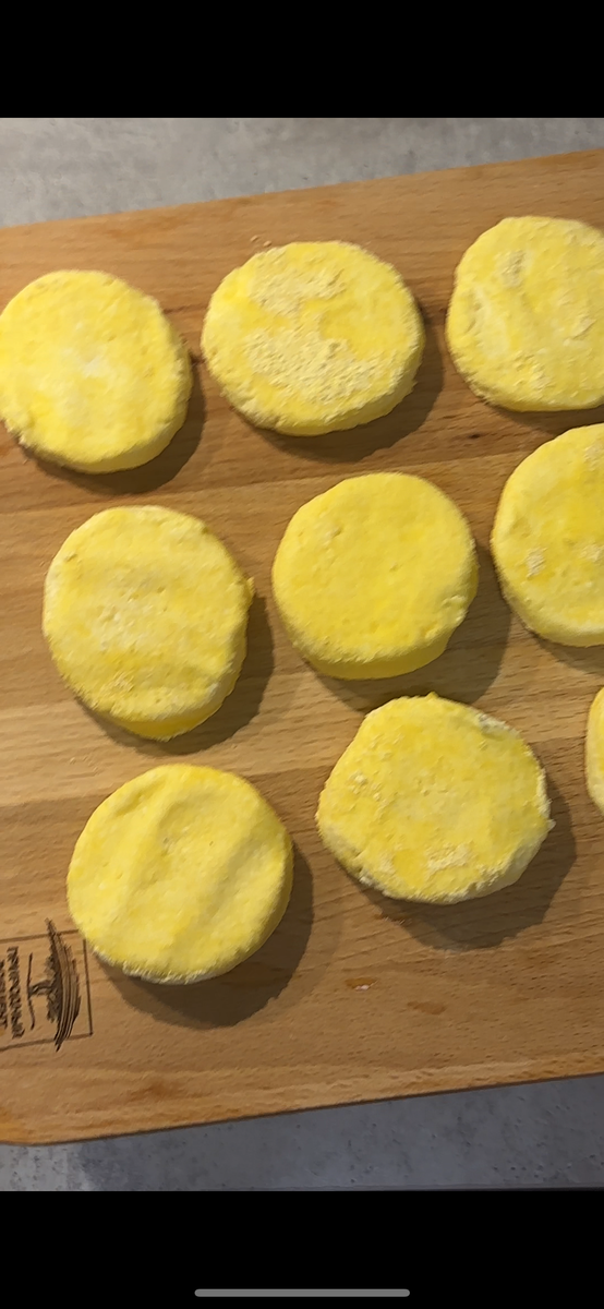 На стол или доску насыпаем кукурузную муку.Формируем кружочки и обваливаем в муке.