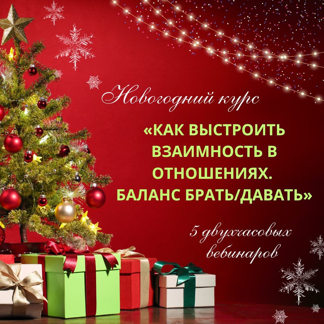 Скоро новый курс в новогодние праздники: «Как выстроить взаимность в отношениях. Баланс брать/давать»! 5 двухчасовых вебинаров. Любые проблемы в отношениях – это нарушение закона баланса брать/давать в своей жизни и в отношениях с другими людьми, близкими и дальними, что приводит к: ❄ Одиночеству в отношениях ❄ Низкой самооценке ❄ Потере своей значимости и ценности ❄ Потере чувств и влечения ❄ Потере интереса к партнёру ❄ Внутренним и внешним конфликтам ❄ Потере своей ценности и привлекательности ❄ Манипуляциям, критике и претензиям ❄ Болезням и психосоматике ❄ Потере ресурсов для жизни ❄ Перееданию ❄ Негативным чувствам и эмоциям ❄ К негативным мыслям и страданию ❄ Потере средств к существованию ❄ Разрушению практически всех отношений в жизни человека ❄ К конфликту с детьми и их зависимости ❄ Зависанию в одной жизненной роли ❄ Потере радости и счастья в жизни ❄ Потере близости и внешних опор ❄ Внутренним конфликтам и расщеплению Всё это и много других проблем из-за одной вещи — неуме