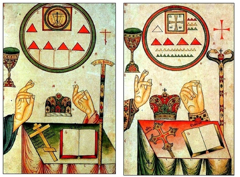 1. Двоеперстие, древняя, унаследованная от апостольских времен форма перстосложения при крестном знамении, было названо «арменскою ересью» и заменено на троеперстие. В качестве священнического перстосложения для благословения была введена так называемая малакса, или именословное перстосложение. В толковании двоеперстного крестного знамения два протянутых перста означают две природы Христа (Божественную и человеческую), а три (пятый, четвертый и первый), сложенных у ладони, — Святую Троицу. Введя троеперстие (означающее одну Троицу), Никон не только пренебрегал догматом о Богочеловечестве Христа, но и вводил «богострастную» ересь (то есть, по сути, утверждал, что на кресте страдала не только человеческая природа Христа, а вся Святая Троица). Это новшество, введённое в Русской Церкви Никоном, было очень серьёзным догматическим искажением, поскольку крестное знамение во все времена являлось для православных христиан видимым Символом веры.