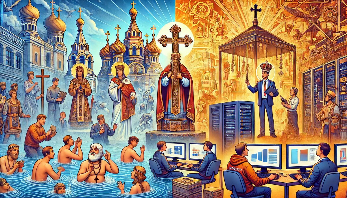 Крещение Руси - это как массовое обновление ПО на всех устройствах компании. Владимир не просто "нажал кнопку", он лично участвовал в процессе, показывая пример. Это как если бы Тим Кук сам установил новую iOS на iPhone каждого сотрудника Apple. Урок: лидер должен быть в авангарде изменений.