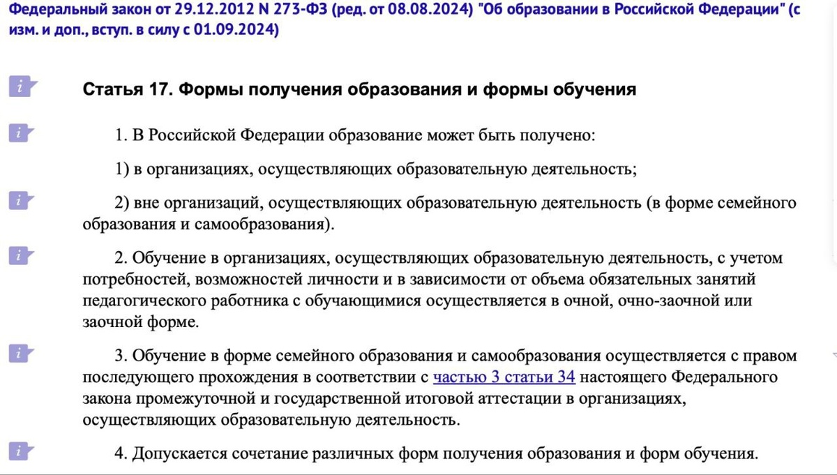 «Об образовании в Российской Федерации» (далее – Федеральный закон) общее образование может быть получено в организациях, осуществляющих образовательную деятельность, а также вне образовательных организаций в форме семейного образования и самообразования. Частью 3 статьи 34 Федерального закона определено, что лица, осваивающие основную образовательную программу в форме самообразования или семейного образования либо обучавшиеся по не имеющей государственной аккредитации образовательной программе, вправе пройти экстерном промежуточную и государственную итоговую аттестацию в организации, осуществляющей образовательную деятельность по соответствующей имеющей государственную аккредитацию образовательной программе. Указанные лица, не имеющие основного общего или среднего общего образования, вправе пройти экстерном промежуточную и государственную итоговую аттестацию в организации, осуществляющей образовательную деятельность по соответствующей имеющей государственную аккредитацию основной общеобразовательной программе, бесплатно.