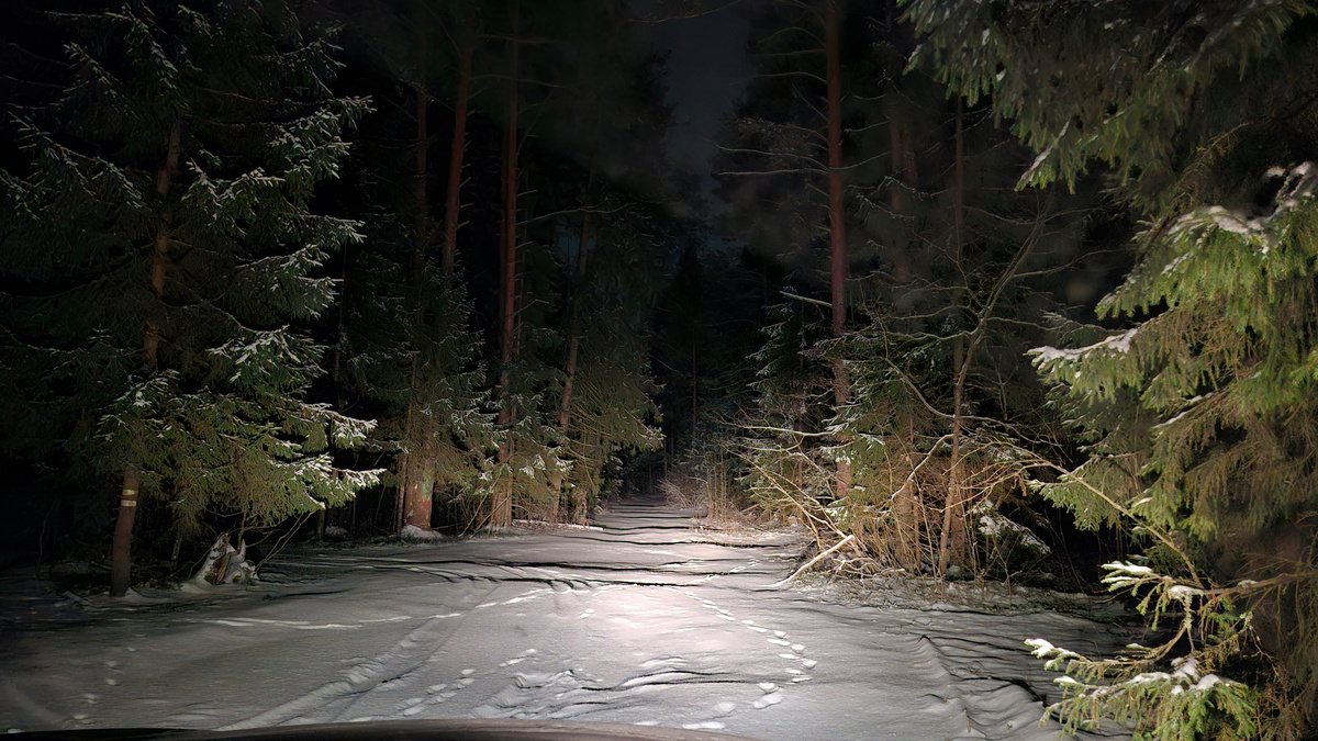 В ночь на пятницу, 13-е захотелось любви и драйва. Жизненный опыт подсказывает, что после любви драйва не захочется. А вот после драйва любовь получается отлично. Решено – сначала драйв. 150 км туда и обратно – как говорится, бешеной собаке не крюк. Ну, поехали! Ночной лес встретил дружелюбно. Уже подмёрзло, но ещё не занесло снегом. На пикапе Isuzu D-max проедем легко. Так и получилось… ну, почти. По осени глубокие ямы залило водой, потом их прихватило ещё слабым льдом, потом слегка припорошило снегом. Объехать ямы не везде возможно. Пикап своим весом проламывает тонкий лёд, причём своей тяжёлой передней частью. Глубина падения от уровня льда до грунта 30-50 см. Не катастрофа для полноприводного автомобиля на раме с понижайкой и блокировкой, но неприятность для пластикового бампера. Кусок бампера отломил. Эх, где мой металлический силовой обвес, который был у меня на прежнем УАЗ-Патриоте?! Но зато скуку разогнал. Выехали к реке на известную площадку, где можно поймать дзен. Костёр, ко