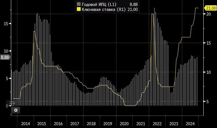ЦБ РФ, вероятно, занял выжидательную позицию с перспективой перехода к снижению ключевой ставки в 1К25 - Росбанк ЦБ РФ, вероятно, занял выжидательную позицию с перспективой перехода к снижению ключевой ставки в 1К25, полагает директор офиса рыночных исследований и стратегии Росбанка Евгений Кошелев. "Решение Банка России сохранить ключевую ставку на уровне 21% несколько удивило нас, - отмечает эксперт. - И, судя по предварительным консенсус прогнозам экспертов, удивило не только нас. В пояснении к решению можем выделить несколько интересных "новаций" в риторике и формулировках, которые указывают на то, что система принятия решений оказалась не только шире, но и более гибкой относительно заданных ранее ориентиров.Во-первых, регулятор использовал нестандартную формулировку об автономных (от денежно-кредитной политики) факторах ужесточения денежно-кредитной политики. Формально это обстоятельство контрастирует с остальными характеристиками экономической динамики - в разрезе ценовой динамик