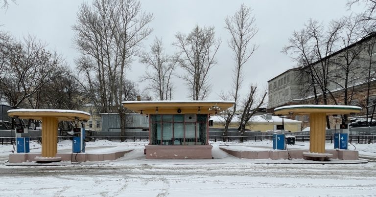 Будка кассы и две элегантные папирусообразные колонны под плоскими крышами — бензоколонка на Волхонке (д. 14, стр. 5), последний привет от невоздвигнутого колосса Дворца Советов. «Прежде всего, сама громадность размера — это пролетарский стиль… Мы стремимся к грандиозным размерам не потому, почему добивался громадных масштабов какой-нибудь безумный император вроде Нерона или американские капиталисты… У нас одновременно утилитарные задачи (ибо в Москве не можем жить без зала на 20 тыс. человек, потому что негде видеть и слышать вождей), но в то же время самая грандиозность размеров присуща зданиям пролетариата», — так в 1932 году нарком просвещения товарищ Луначарский на расширенном пленуме объяснял гигантоманию, возобладавшую в проектировании Дворца Советов. Повышенная грандиозность, как мы хорошо знаем, обернулась впадиной бассейна «Москва», уже исчезнувшей, а на месте когда-то взорванного храма вновь построили храм. За перипетиями все эти годы из-за небольшой ограды безмолвно наблю