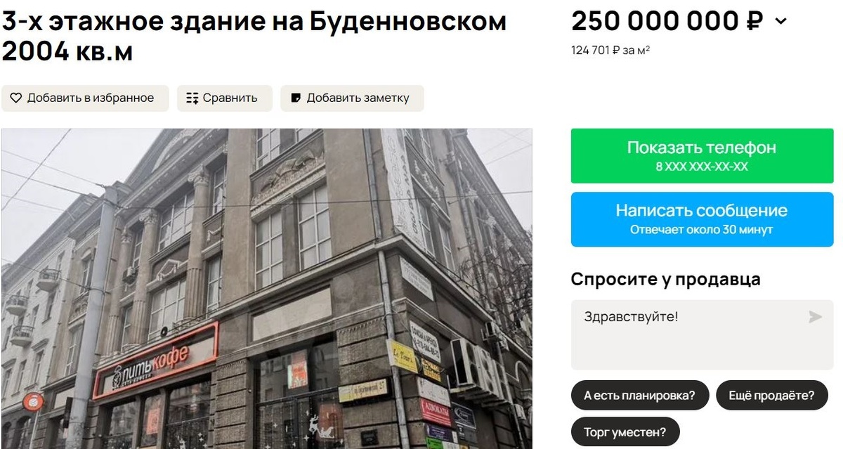 Ростовская область, 20 декабря 2024. DON24.RU. Еще один памятник архитектуры в Ростове – административное здание конторы «Заготзерно» на пр. Буденновском, 27, – выставлен на продажу. Объявление появилось на популярном сайте продаж. Здание является объектом культурного наследия регионального значения. Его стоимость оценили в 250 млн рублей. Площадь здания – 2004,8 кв. м. Дом возведен в начале XX века. В годы Великой Отечественной войны был практически полностью разрушен, за исключением главного фасада. Фото: Ксения Пащенко / don24.ru / АО «Дон-медиа» В 1949 году по проекту архитектора В. В. Леонтьева здание было восстановлено с использованием форм и декора, характерных для архитектуры послевоенных лет. Фото: здание на пр. Буденновском, 27 / pastvu.com Отметим, что это не первая попытка продать здание. Объект выставлялся на продажу и в начале текущего года, и ранее. До этого в Ростове выставили на продажу доходный дом известного мецената и коллекционера живописи Павла Крамера.