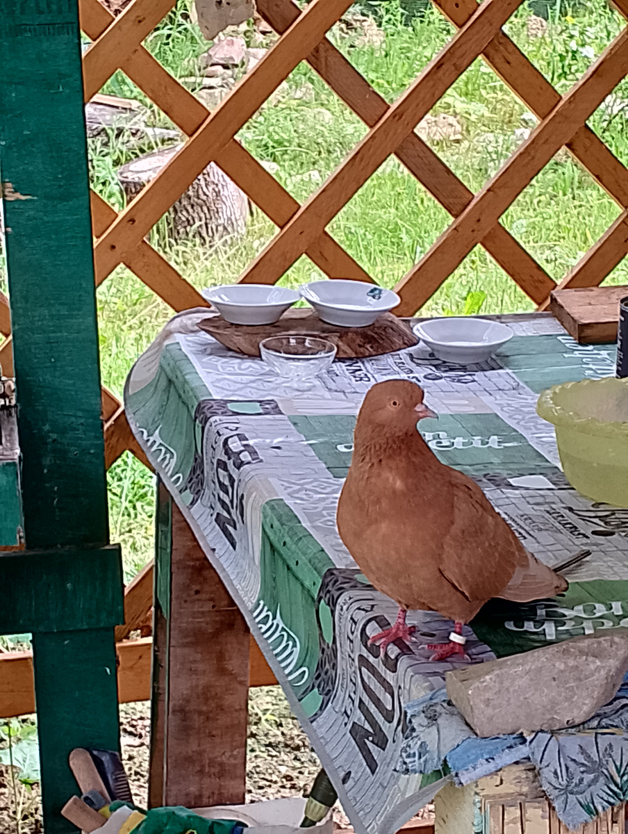 Затем она слетела с крыши и залетела под навес, усевшись на опору. На лапке у неё было кольцо с номером. У нас в СНТ есть голубятня, в 20 минутах пешком. Я решила, что беглянка оттуда и разместила в чате фото с вопросом «Чья пропажа?». Ответа не последовало.