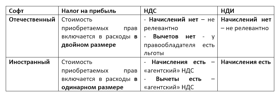 *.в таблице приведен общий подход к определению налоговых эффектов без учета особенностей конкретных сделок, их документирования, наличия действующих СИДН и их условий (в случае покупки иностранного софта) и т.д.