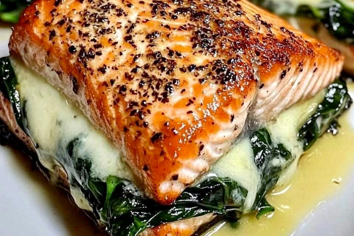 Чёрный лосось, фаршированный шпинатом и пармезаном Фаршированный лосось — это не только красиво и вкусно, но и полезно! В этом рецепте нежное филе сочетается с ароматной начинкой из шпината и двух видов сыра, создавая идеальное блюдо для обеда или ужина. Простота приготовления делает его доступным даже для начинающих кулинаров.