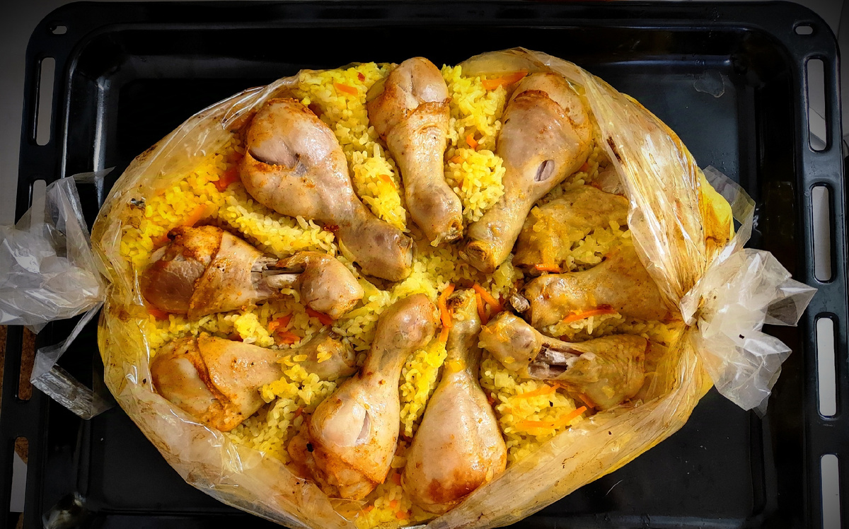 Рада приветствовать Вас на моём канале! Основная идея этого ужина проста: выложить курицу и рис в рукав для запекания, добавить воды, подождать 1 час и готово! 1) Куриные ножки обвалять в смеси из 1 ст.л. растительного масла, соли, паприки, приправы для курицы, чёрного перца и сушёного чеснока. 2) Два стакана риса промыть. Добавить мелко порезанный лук, морковь, нарезанную соломкой, куркуму и соль. Перемешать. 3) Рукав для запекания завязать с одной стороны. Выложить в него рис с овощами и разровнять. 4) Сверху на рис выложить куриные ножки и кусочки сливочного масла. 5) В рукав влить 4 стакана воды и завязать с другой стороны. 6) Сделать два маленьких надреза ножницами (каждый по 5 мм). Проколы нужны для того, чтобы рукав в процессе запекания не лопнул. 7) Отправляю запекаться рис с курицей в духовку на противень при 180 градусах на 1 час (режим "вверх-вниз" + конвекция). После того как от начала запекания прошло 45 минут я проверяю готовность риса и при необходимости подлива