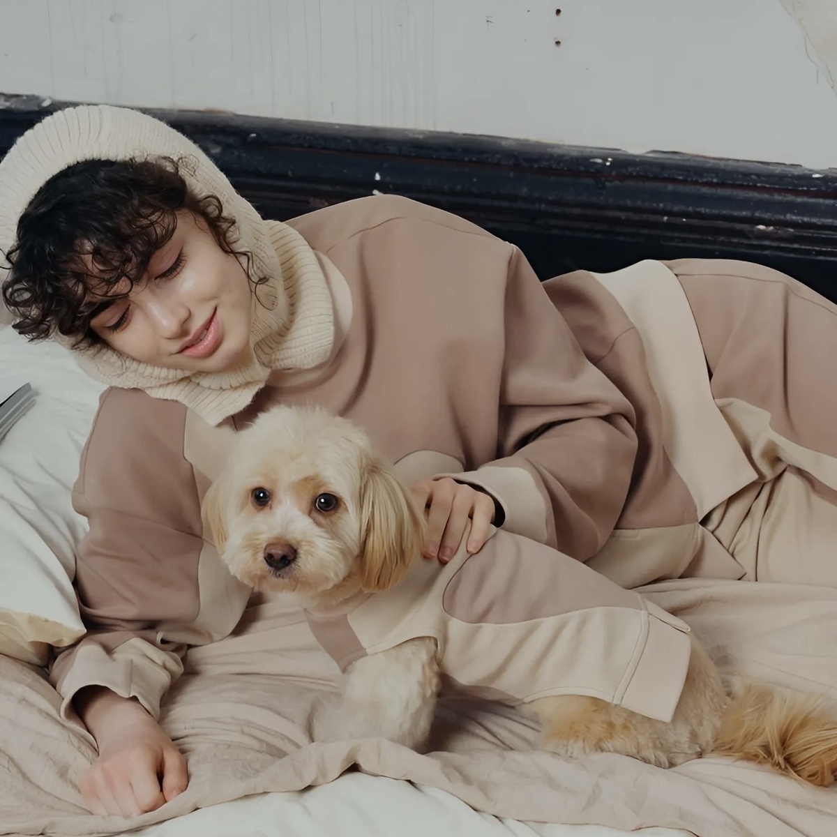 [Свитшоты для собачки и человека] могут быть украшены одинаковыми узорами, логотипами или надписями, создавая целостный [образ для хозяина и его питомца].