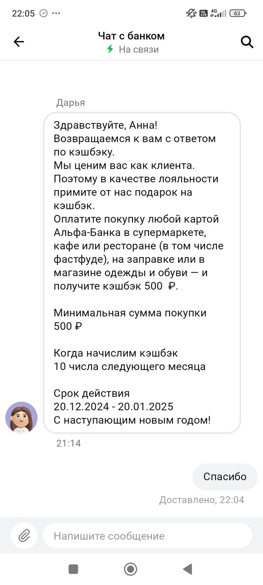 Я на днях написала в поддержку Альфа- банка, с претензией, почему у меня Кэшбэк 0.5% на все категории, и как мне обидно. Мне предложили пройти какие- то задания, на что я возмутмлась , аргументировав тем, зачем мне утруждаться и делать их задания для повышения Кэшбэка в их банке, когда в другом мне эти же условия в другом банке. Мне сегодня пришел ответ, которым я осталась довольна. Дарят 500 рублей Кэшбэком на следующую покупку. До Нового Года ещё будем ходим в магазин, обязательно заберу свой Повышенный Кэшбэк 💵 😁