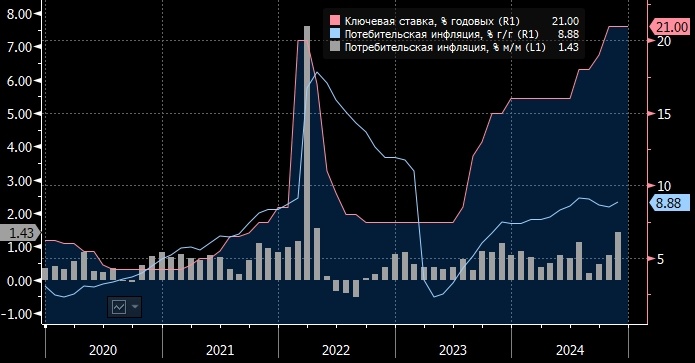 Инфляция будет замедляться медленно. Базовым сценарием на 2025 год пока является удержание ключевой ставки Банком России на уровне 21% годовых, считает главный аналитик Совкомбанка Михаил Васильев. «Банк России неожиданно для рынка сохранил ключевую ставку неизменной на уровне 21%, — пишет эксперт. — ЦБ учёл существенное ужесточение денежно-кредитных условий, которое произошло в последние месяцы. Ставки по кредитам для заемщиков существенно выросли из-за ужесточения нормативов для банков. Поэтому Банку России не пришлось повышать ключевую ставку, чтобы значимо ужесточить финансовые условия. Учитывая, что денежно-кредитная политика действует на экономику и инфляцию с задержкой в 3–6 кварталов, Банк России решил взять паузу и оценить влияние текущих крайне жестких денежно-кредитных условий на экономику». По мнению Васильева, уже наблюдается серьезное замедление розничного кредитования и первые признаки замедления корпоративного кредитования. Темпы роста корпоративного и розничного кредит