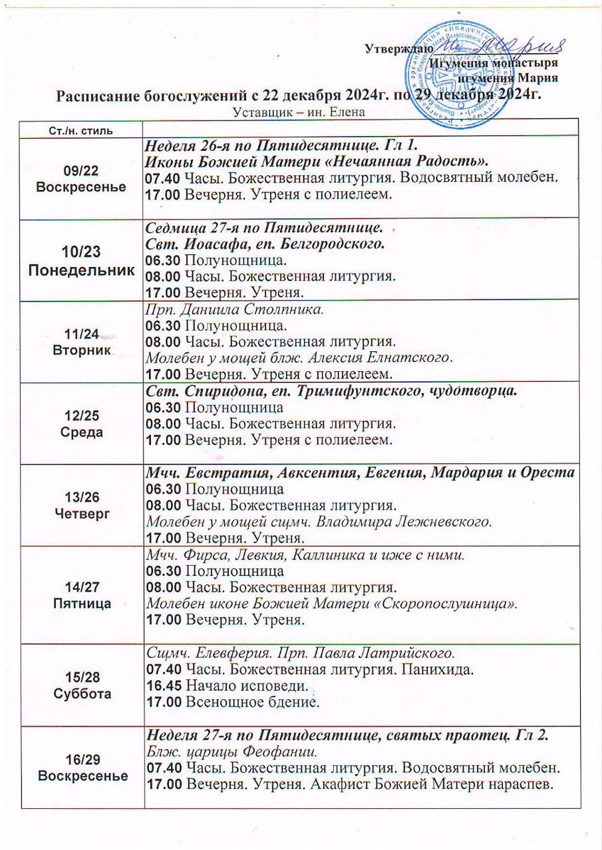 22-29.12. Расписание богослужений в Введенском женском монастыре
