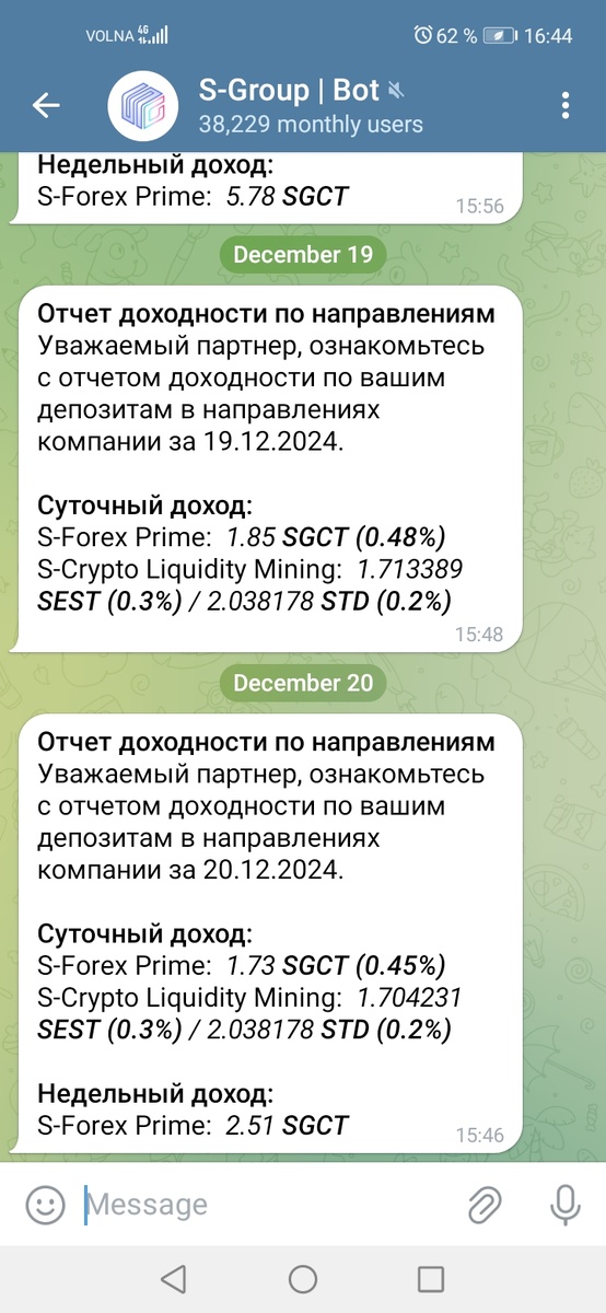 19.12.24: sgct = 1.85 (192.40 руб) std = 2.038178 (20.38 руб) sest = 1.713389 (212.46 руб) Итого: 425.24 руб 20.12. 24: sgct = 1.73 (179.92 руб) std = 1.871133 (18.71.руб) sest = 1.704231 (211.32 руб) Итого: 409.96 руб Итого за 2 дня: 835.20 руб Недельный доход 2.51 sgct (261.04) оставляю на балансе для реинвеста в конце месяца. Я на шаг ближе к своим финансовым целям!