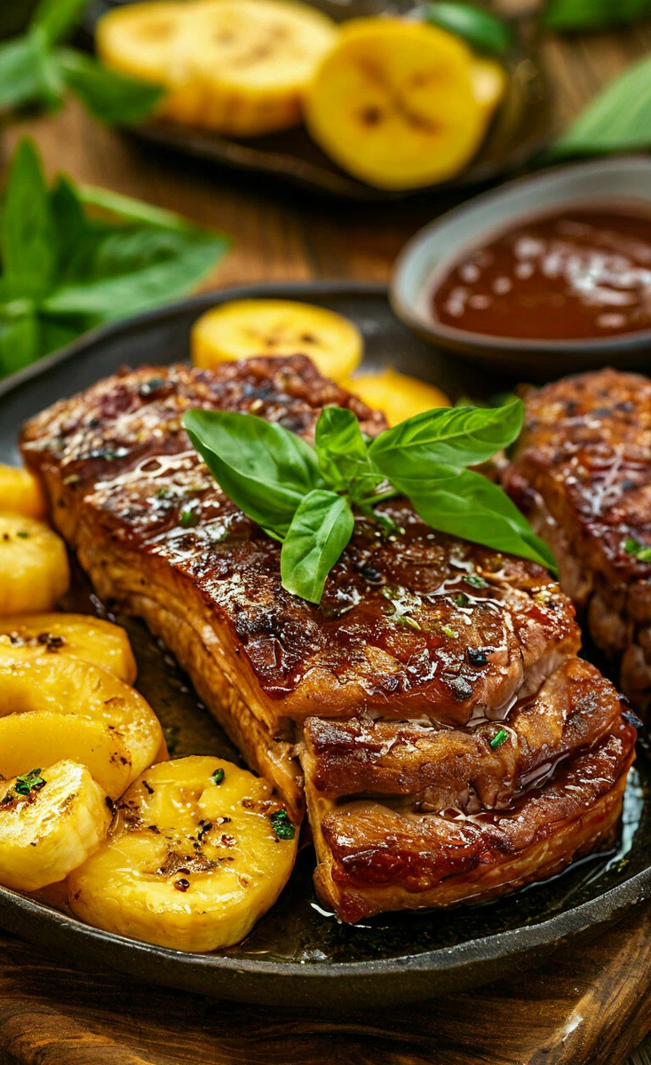 Приготовление: Для соуса нарезать сладкий перец кубиками, нарубить лук и чеснок. Разогреть в сотейнике 2 ст. л. растительного масла, положить лук, чеснок, перец и жарить, помешивая, 5 минут. Далее влить к овощам бульон и соевый соус, довести до кипения и тушить на среднем огне 10 минут. Мясо вымыть, обсушить бумажным полотенцем, нарезать порционными кусками и отбить. В сковородке разогреть оставшееся растительное масло, и обжарить свинину с двух сторон до подрумянивания. Очистить бананы и нарезать их кружочками. Добавить в сковородку к мясу и жарить всё вместе ещё 5 минут. Готовое блюдо украсить базиликом. Соус подавать отдельно.