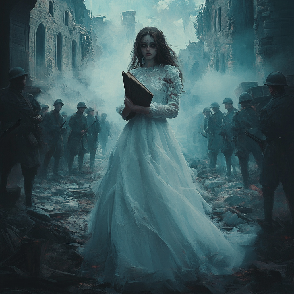 "Мы не знали, что в башне была библиотека. Тысячи старинных книг, манускрипты, фамилиен цаубербухен, как она потом назвала… Я первым вошёл туда и увидел её — Ильзу фон Штернберг. Она стояла у окна, одетая в белое платье, которое будто светилось в сером утреннем сумраке. В руках она держала древнюю книгу и… пела."