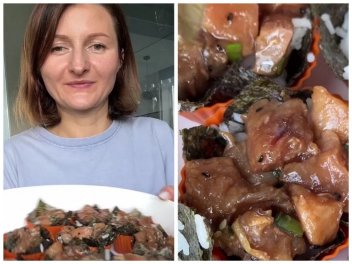 Рис уже отварен. Ничего в него не добавляла. Кладём столовую ложку риса в подготовленный лист нори, теперь - в форму для кекса. Поверх риса - замаринованную рыбку.