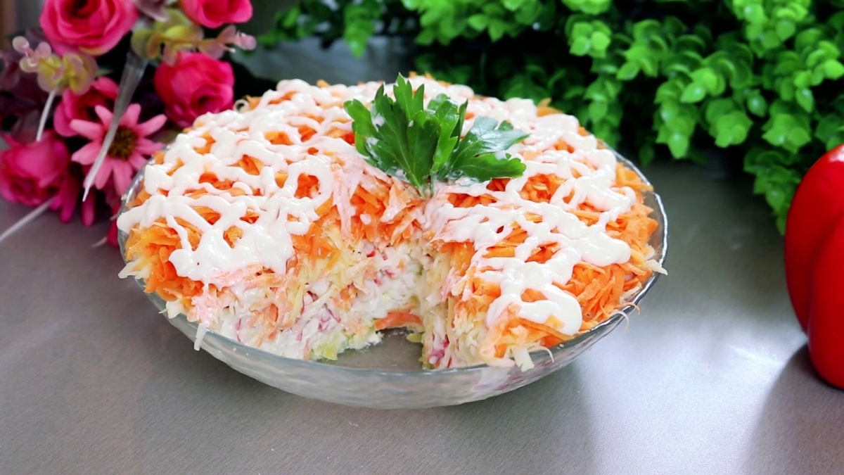 Краткая подборка нестандартных салатов к новогоднему столу🥗 Картофель среднего размера - 1 шт., Крабовые палочки - 120 г, Сыр твердый - 50 г, Морковь отварная - 60 г, Яйцо - 1 шт. Майонез - по вкусу, Соль - по вкусу. На дно салатника выложите натертый на мелкой терке отварной картофель, посолите его и дополните сверху сеточкой из майонеза. Следующим слоем выложите натертое на мелкой тёрке яйцо. Следом - майонез. Затем натрите на мелкой терке крабовые палочки или крабовое мясо. Снова смажьте слой небольшим количеством майонеза. Натрите сыр на мелкой терке и уложите следующим слоем, плюс майонез. Последний слой - это натертая на мелкой терке отварная морковь. Оставьте салат в холодильнике на несколько часов, чтобы он хорошо пропитался. Перед подачей салат с крабовыми палочками и отварной морковью можно украсить свежей зеленью. Приятного аппетита! Куриное филе - 360 г, Шампиньоны - 6 шт., Куриные яйца - 3 шт., Консервированный горошек - 0,5 банки, Репчатый лук - 0,5 шт., Солёные огурцы -