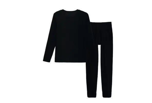 Материал отличается небольшой толщиной и высокой эластичностью, благодаря чему изделие остается незаметным под верхней одеждой и не стесняет движений. Конструктивные особенности включают эластичный ворот на верхней части и широкий пояс на брюках, обеспечивающие надежную фиксацию.