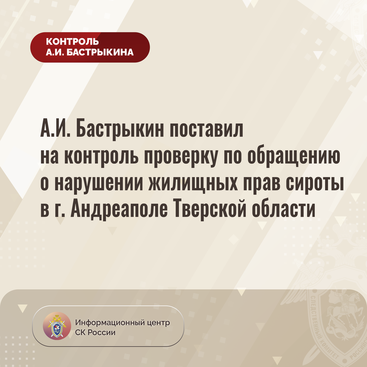А.И. Бастрыкин поставил на контроль проверку по обращению о нарушении жилищных прав сироты в г. Андреаполе Тверской области В комментариях в аккаунте Информационного центра СК России «ВКонтакте» обратился сирота из города Андреаполя Тверской области о длительном непринятии мер к обеспечению его положенным по закону жилым помещением. Несмотря на то, что молодой человек с 2016 года состоит в очереди, до настоящего времени его права не реализованы. Многочисленные обращения результатов не принесли. В настоящее время сирота находится в трудном финансовом положении и вынужден проживать в непригодных условиях. В СУ СК России по Тверской области по доводам комментария начата процессуальная проверка. Председатель Следственного комитета Российской Федерации Александр Иванович Бастрыкин поставил ход процессуальной проверки на контроль в центральном аппарате ведомства и поручил руководителю СУ СК России по Тверской области Альберту Андреевичу Кизимову представить доклад о ее промежуточных результ