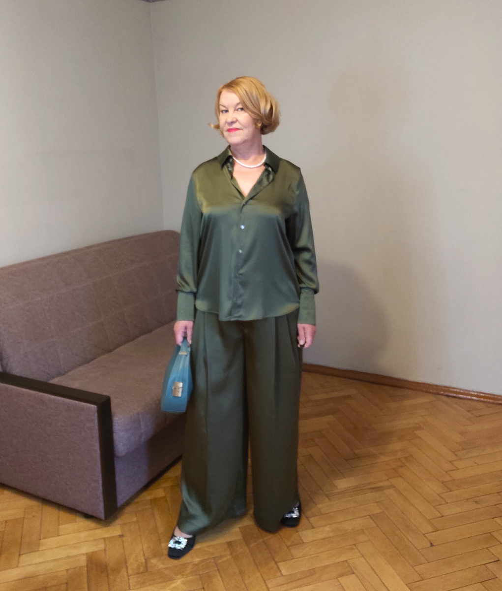 Всем привет дорогие мои подписчики и читатели. Незаметно пролетела еще одна рабочая неделя. Предстоит последняя, самая долгая предновогодняя рабочая неделя. В эти выходные мы с подписчиками решили устроить себе предновогодний корпоратив. Он должен подвести итог этого далеко не простого года. А в этом году, почему-то захотелось по-настоящему отметить Новый год. Уж не знаю почему. Может, соскучилась по настоящему празднику? Может быть. Поэтому, хочется быть завтра по-настоящему празднично одетой. Как новогодняя ёлка наверное. 🤣 В общем, я совсем растерялась в чем же мне завтра идти в ресторан. Пойти в зеленом атласном костюме. Он выглядит очень нарядно. К тому же, я его вряд ли ещё куда-то надену. Предновогодний корпоратив в ресторане, пожалуй единственно подходящее для этого костюма мероприятие. Этот костюм можно носить в нескольких вариантах. Можно надеть рубашку свободно сверху, не заправляя в брюки, как на фото выше. В таком варианте, этот костюм мне носить наиболее комфортно,