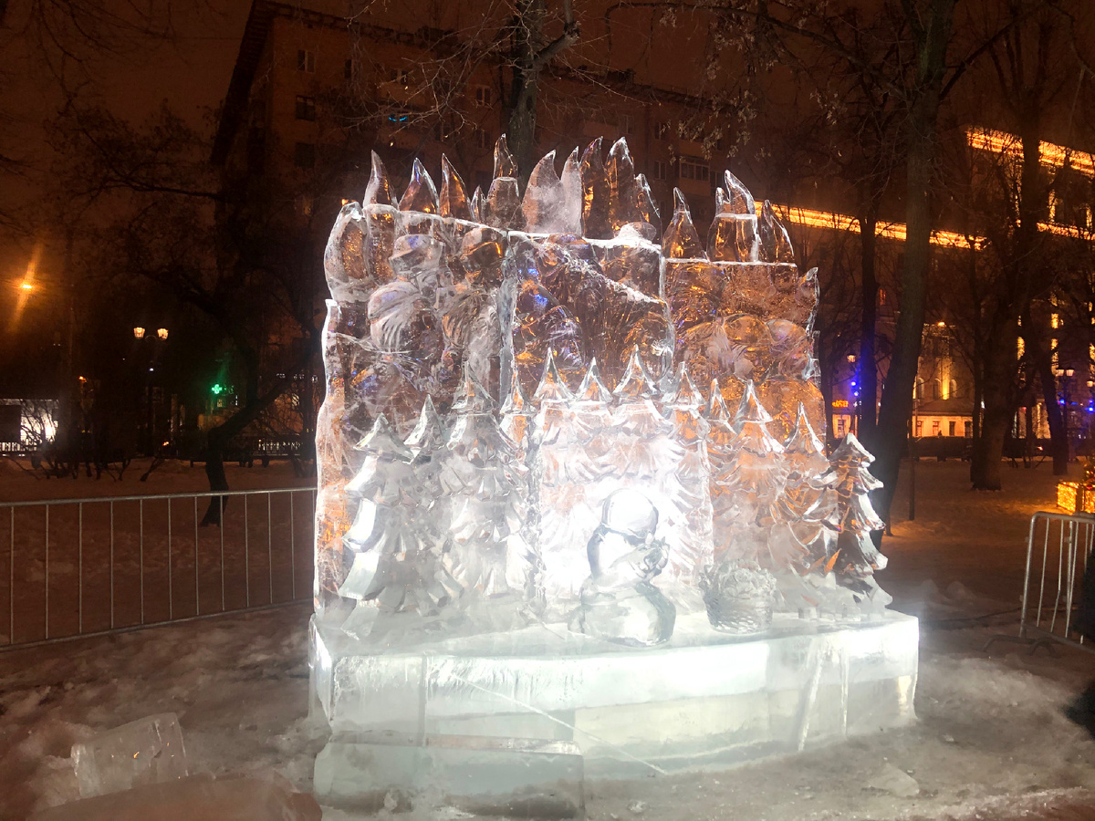 Уже месяц Москву украшают к Новому году, вот настало время и для ледяных скульптур. Жаль только оттепель пришла: ещё вчера было минус 17, а сегодня уже плюс три - обычный декабрь. Выдержат ли фигурки нашу промозглую погоду? Буквально в двух минутах от станции метро Чистые пруды на бульваре начали устанавливать скульптуры изо льда. Здесь оживают сказки. Вот девочка с корзиной новогодних подснежников, а за ёлками едва различимы двенадцать месяцев... ну или кто-то из них) Работы ещё ведутся. Рядом со скульптурами лежат огромные блоки прозрачного льда, а кое-где и рабочий инструмент. Всевозможные ёлки, зайки, белки, мишки, сани, полные подарков, северные олени и конечно, Дедушка Мороз со Снегурочкой замерли в ожидании. Сфотографировать вечером всё это великолепие сложно, освещение на бульваре загадочное, огоньки всё время меняются, лёд бликует. Здесь, кажется, будет сказочный замок... или терем Деда Мороза? Посмотрим через пару дней... Последние фигуры ещё не доделаны, рядом даже верстак
