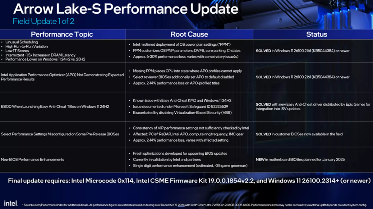 Intel выступила с подробным объяснением проблем, мешавших запуску ее настольных процессоров Core Ultra 200 Arrow Lake, которые дебютировали с неутешительными отзывами ещё два месяца назад. Компания определила пять основных проблем, которые способствовали несоответствию между её внутренними ожиданиями производительности и реальным использованием. Во время запуска процессоров линейки Arrow Lake компания обещала серьёзное повышение производительности в многопоточных рабочих нагрузках, энергоэффективности и возможностям ввода-вывода, а также разгона. Однако пользователи встретили процессоры с тревогой, особенно из-за неубедительной производительности в играх. Пользователи и рецензенты также столкнулись с более высокой, чем ожидалось, задержкой и проблемами совместимости. После первоначального молчания по этому вопросу Intel начала расследование, чтобы понять и решить проблемы, связанные с играми. К 8 ноября она установила ранние индикаторы для того, чтобы в течение 4–6 недель провести публ