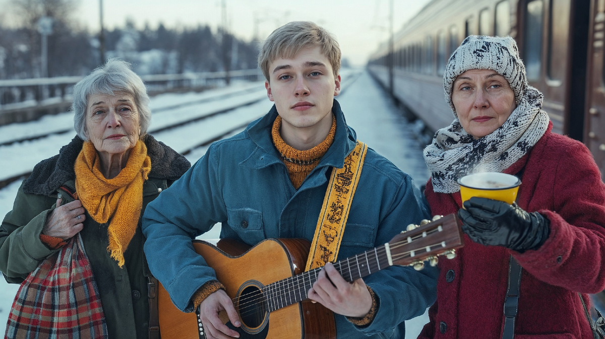 За окном быстро темнело. Поезд качало на поворотах, изредка раздавался металлический скрежет. В вагоне становилось тише, только шёпот разговоров соседей и тихий звук колес, отбивавших ровный ритм. Саша вдруг достал свою гитару, посмотрел на Валентину Ивановну, потом на Елену, и, будто сомневаясь, начал наигрывать мелодию.