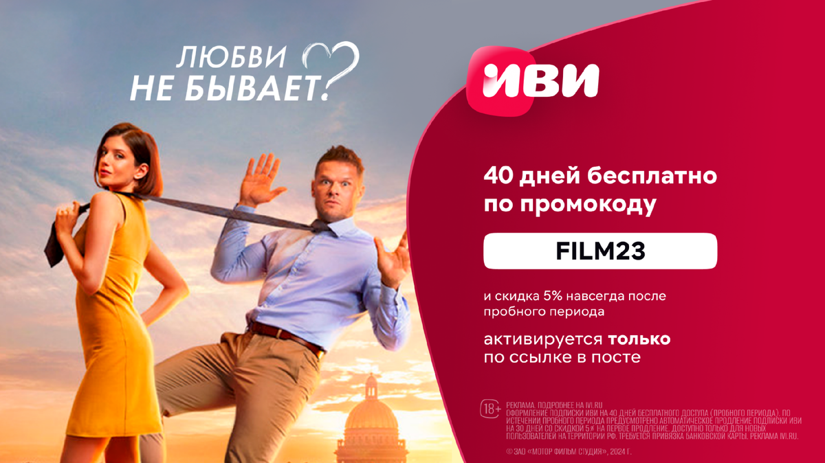 Реклама. Подробнее на ivi.ru. Срок активации промокода: до 31.12.2024 г. включительно. Только для новых пользователей на территории РФ. Оформление подписки Иви на 40 дней бесплатного доступа (пробного периода). По истечении пробного периода предусмотрено автоматическое продление подписки Иви на 30 дней со скидкой 5% на все последующие продления. Требуется привязка банковской карты. Сервис Иви 18+.