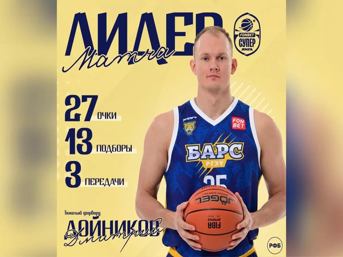Лучшим игроком матча БК «Барс-РГЭУ» с «Динамо» был признан Дмитрий Дойников. Встреча прошла 18 декабря в рамках Суперлиги 2024/25.
