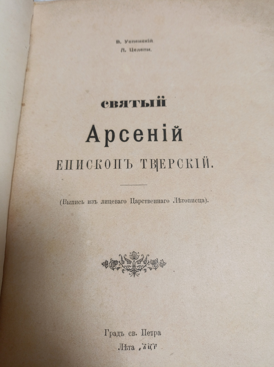 Святой Арсений епископ Тверской : (Выпись из лицевого Царственного летописца) / [сост.] В. Успенский, Л. Целепи. - Санкт-Петербург : печ. В.В. Комарова, 1903. - [2], XVI, 58 с. : ил. ; 30 см. - Текст памятника на древнерус. яз. - На тит. л. место печати: Град. св. Петра; год изд. обозначен старославян. цифрами . Епископ Арсений (?-1409) — епископ Русской православной церкви, епископ Тверской, автор древнейшей редакции Киево-Печерского патерика. Сведения, почерпнутые об Арсении из Лицевого царственного летописца, относят к XVI (по мнению других ученых, к XVII в.). Родился в Твери, в молодых летах принял постриг в Киево-Печерском монастыре. При митрополите Киевском Киприане (1380–1382) он служил архидиаконом, во время отсутствия митрополита управлял делами Киевской митрополии. 3 июля 1390 года он вместе с митрополитом Киприаном прибыл в Тверь, где по просьбе Тверского князя Михаила Александровича состоялся Собор русских и греческих иерархов для суда над Тверским епископом Евфимием. Вст