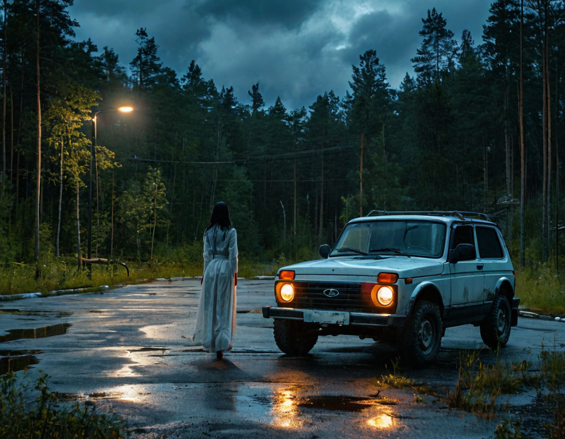 «Она» стояла на руках и коленях на капоте, лбом прижавшись к стеклу. У неё были два чистых белых глаза, длинные грязные чёрные волосы, доходившие до ног, и единственное белое платье, доходившее до щиколоток.