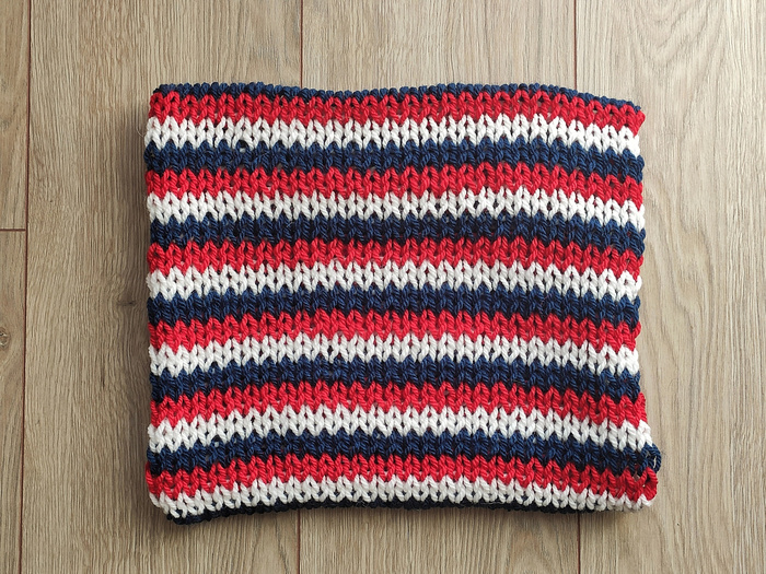 Вот такой патриотичный шарф получился в подарок на Новый год для друзей. Думал, что вязать будет гораздо сложнее, но оказалось весьма просто. Да и быстро: буквально за выходные. Так что если вы все еще не знаете, что подарить близким - вот вам интересная идея. Время до Нового года еще есть, хватит на несколько шарфов. Особенно, если взять спицы потолще (8-10 мм). Пряжу лучше выбирать так, чтобы шерсть была не более 50%. Обычно я вяжу из пряжи производства Пехорка: например, Народная или Популярная. Учитывая, что пряжа растягивается со временем, достаточно длины 130-150 см. Количество сантиметров примерно равно количеству рядов. К слову, этот шарф связан лицевой гладью, мне она больше нравится, чем резинка. А еще я обычно делаю из шарфа снуд: связываю вместе начало и конец. Получается такое кольцо, которое обматывается вокруг шеи. Но при этом нить, которой связываю начало и конец, я делаю отдельного цвета, чтобы при желании ее можно было разрезать и вернуть вид обычного шарфа. Доброго в