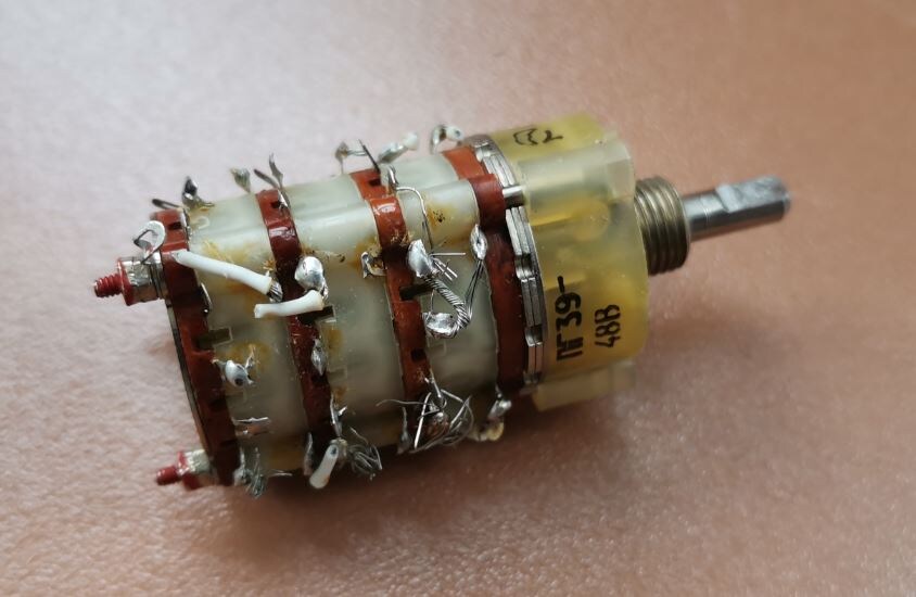 Переключатели галетные ПГ39 предназначены для работы в электрических цепях постоянного и переменного токов в радиоэлектронной аппаратуре. Изготовляется четырех конструктивных исполнений: со сплошной полой осью, со сдвоенными осями. Технические характеристики переключателей типа ПГ39, ПГ39Ш Ток — не более 0,5 А; Напряжение — не более 127 В; Максимальная коммутируемая мощность — 10 В·А; Испытательное напряжение — не менее 500 В (эфф.); Сопротивление контакта — не более 0,05 Ом; Сопротивление изоляции — не менее 1000 МОм; Число коммутационных циклов в нормальных климатических условиях — 30000; Относительная влажность воздуха — до 98 %; Диапазон рабочих температур — от -60°С до +85°С; Минимальная наработка — 10 000 ч; Срок сохраняемости — 15 лет; Масса — не более 22 г. Условные обозначения ПГ39-2В ПГ — переключатель галетный. 39 — порядковый номер разработки. 2 — условный номер типоконструкции переключателя: В — всеклиматическое исполнение. Ценные элементы в переключателе ПГ39-48В Посере