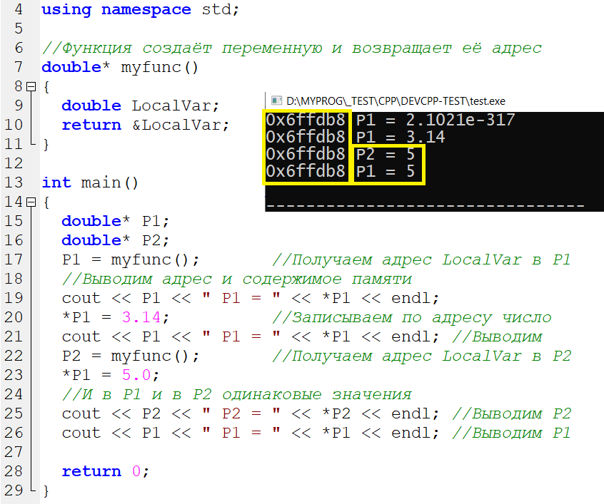 Указатели - это непростая тема. Во всяком случае мне она всегда давалась как-то нелегко. Вроде всё понятно, а начнёшь разбираться с конкретным примером и запутаешься. Вот и сегодня я решил вам подкинуть такой примерчик. Проверьте свою нервную систему на прочность - если вы новичок, то с первого раза понять всё будет сложно. Это касается не только С++, но, поскольку пример будет на этом языке, то и заголовок такой. Начинающие программисты на С++ из-за неполного понимания работы с указателями (хотя я и сам не обладаю полным пониманием))) могут столкнуться с труднонаходимыми ошибками в программе. Пример: Всё это прекрасно компилируется, но в ходе выполнения программы могут возникнуть неожиданности. Дело в том, что переменная LocalVar объявлена внутри функции. То есть является локальной. И поэтому в момент возврата адреса этой переменной из функции, самой переменной уже не существует и адрес ссылается на память, которая в это время может быть использована для каких-то других задач. И это в