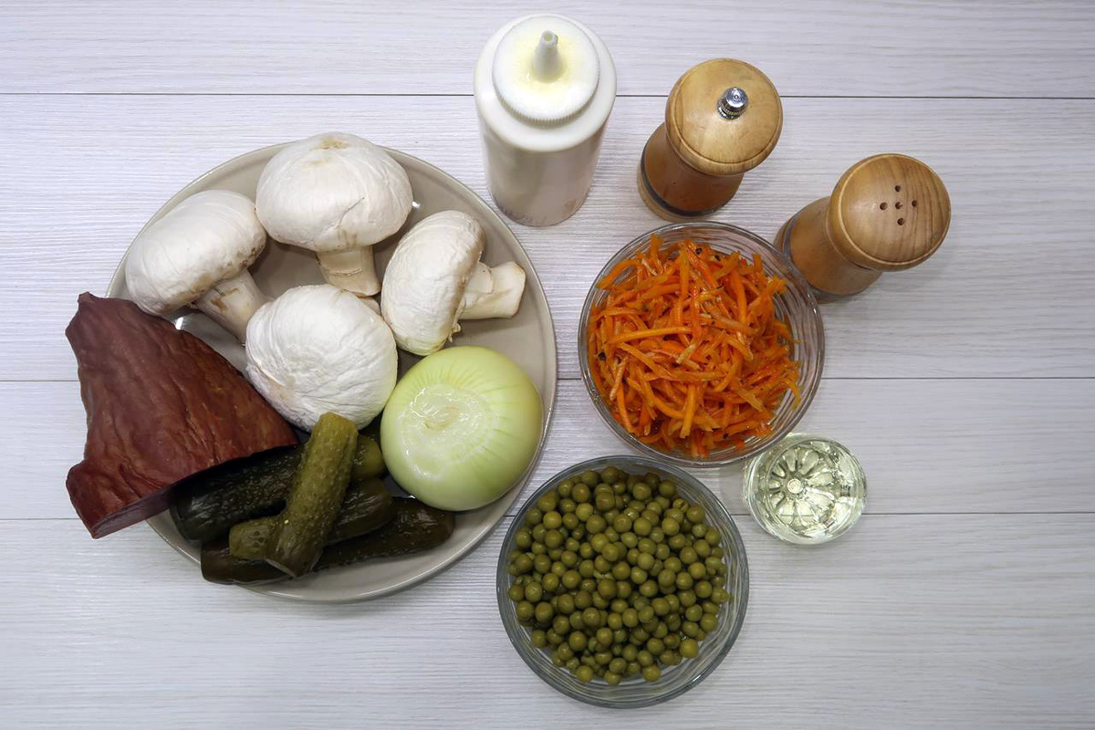 В канун Нового года каждая хозяйка старается найти новые и интересные рецепты для новогоднего стола. Салат с говядиной и зелёным горошком выглядит красиво и ярко. Все ингредиенты этого салата очень хорошо сочетаются друг с другом. Времени и продуктов уйдёт минимум, а вкус получится – пальчики оближешь! Для тех, кто любит краткие рецепты Ингредиенты: Говядина – 350 г Шампиньоны свежие – 250 г Горошек консервированный – 1 банка Огурцы маринованные – 200 г Морковь – по-корейски – 220 г Лук репчатый – 1 луковица Майонез – по вкусу Соль, перец – по вкусу Растительное масло – для жарки 1. Репчатый лук нарезаем четверть кольцами. 2. Свежие шампиньоны нарезаем на небольшие кусочки. 3. На сковороде разогреваем растительное масло и выкладываем репчатый лук и грибы. Лук с грибами обжариваем до готовности около 10 минут. Лучше всего салат с говядиной и зелёным горошком собирать в глубоком салатнике или на плоском блюде, укладывая подготовленные ингредиенты слоями. Я буду собирать салат на плоской