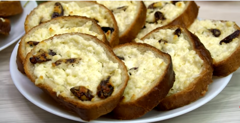 Рецепт: Батон – 1 упаковка Творог -250 гр. Яйцо -1шт. Сахар -3ст.л. Ванильный сахар -1 уп. Сметана -1 ст.л. Изюм – по желанию