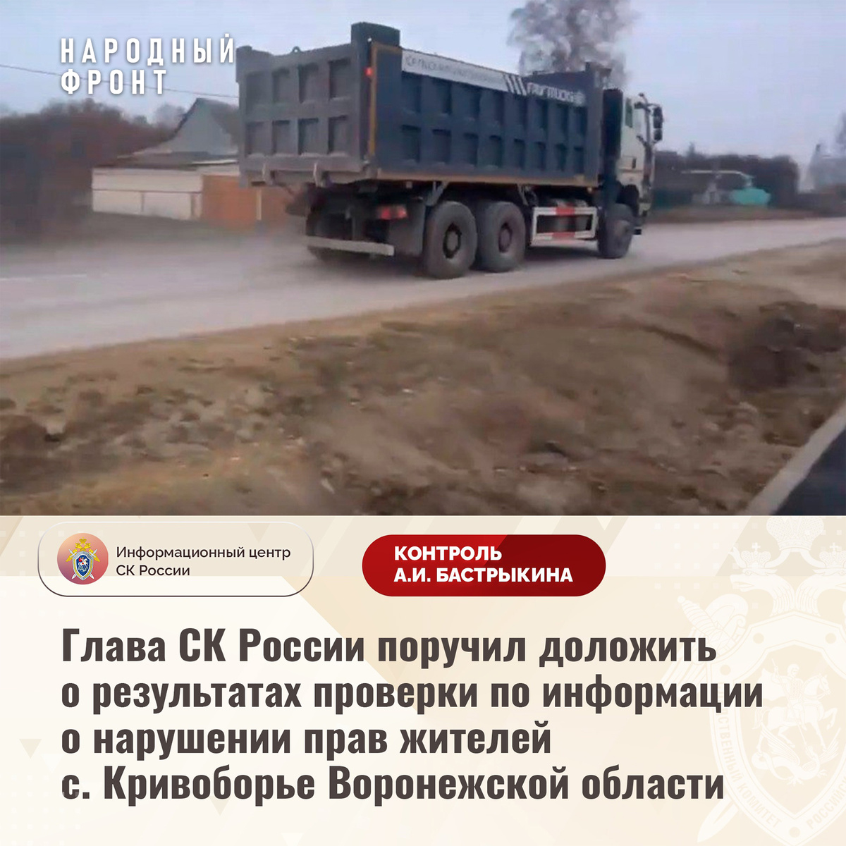 В социальных сетях ведомства сообщается, что глава Следственного комитета России поручил руководителю СУ СК России по Воронежской области Михаилу Селюкову доложить о ходе и результатах процессуальной проверки. Ранее Народный фронт рассказал о жителях рамонского села Кривоборье, которые уже 8 лет добиваются объездной дороги для местных карьеров. Тяжёлая техника использует главную улицу села, при этом большинство не соблюдает скоростной режим. А всё содержимое кузова, который редко прикрывается тентом, разлетается во все стороны. Жители устали от такого беспокойного движения. Народный фронт продолжил следить за ситуацией.