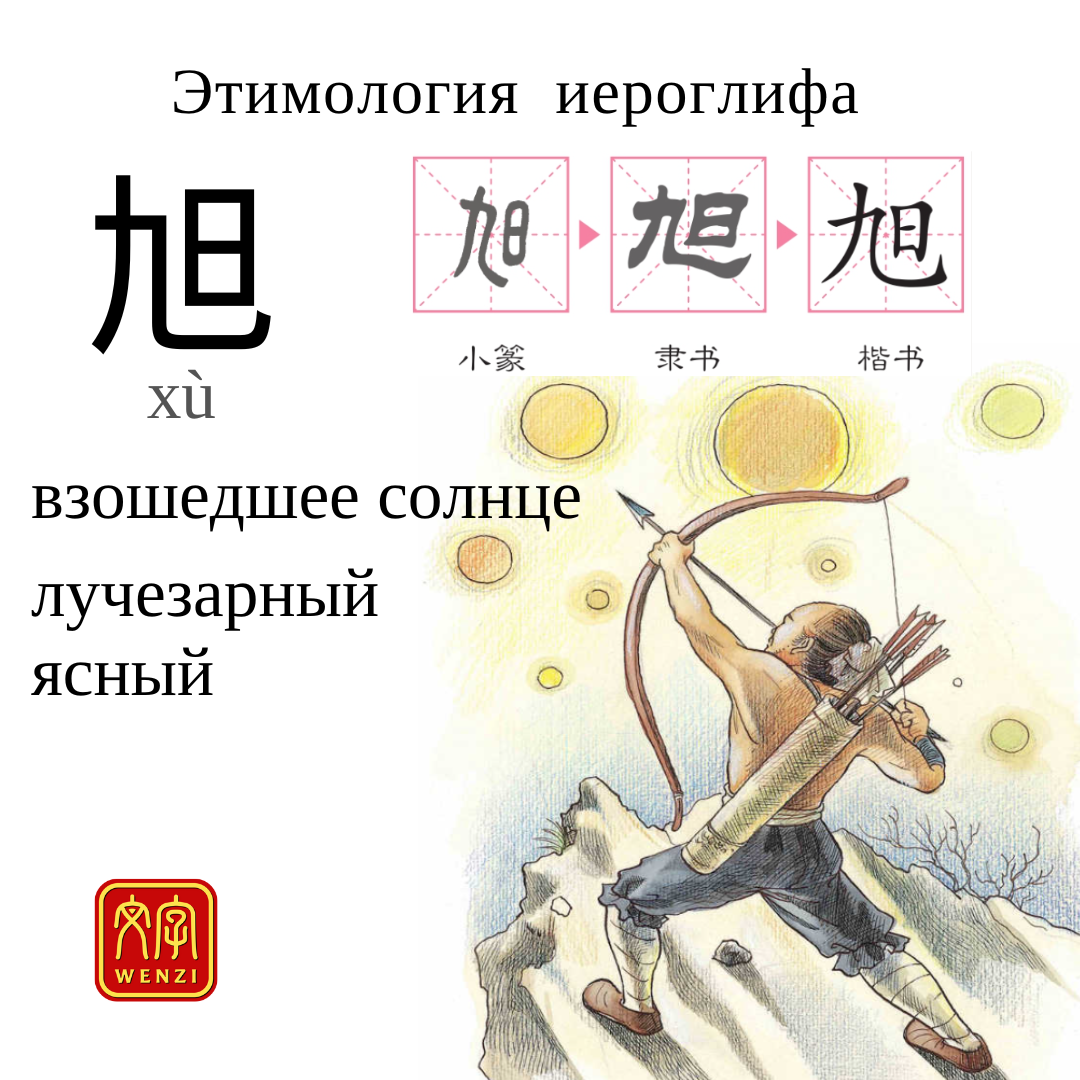 Иероглиф 旭 xù состоит из 九 jiǔ - девять и 日 rì - солнце.