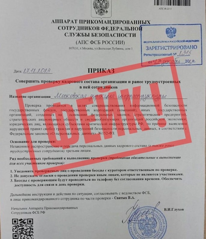 По соцсетям стала расходиться фотография письма, якобы, от ФСБ России. В нем сообщается о проверках организаций в связи с выявленными нарушениями при распространении персональных данных. «Это фейк», — заявили в правительстве Курской области. Как следует из фейкового документа, проверка начала в отношении Московской дирекции инфраструктуры. Якобы были незаконно переданы персональные данные о кадровом составе «Возможно появление поддельных приказов в отношении других организаций», — предупреждают в правительстве Курской области. Юлия КУРАСОВА Постоянный адрес новости на сайте «Друг для друга» ~ https://dddkursk.ru/lenta/2024/12/28/114888/. Новости Курска за ~ 28 декабря ~ декабрь 2024 года.