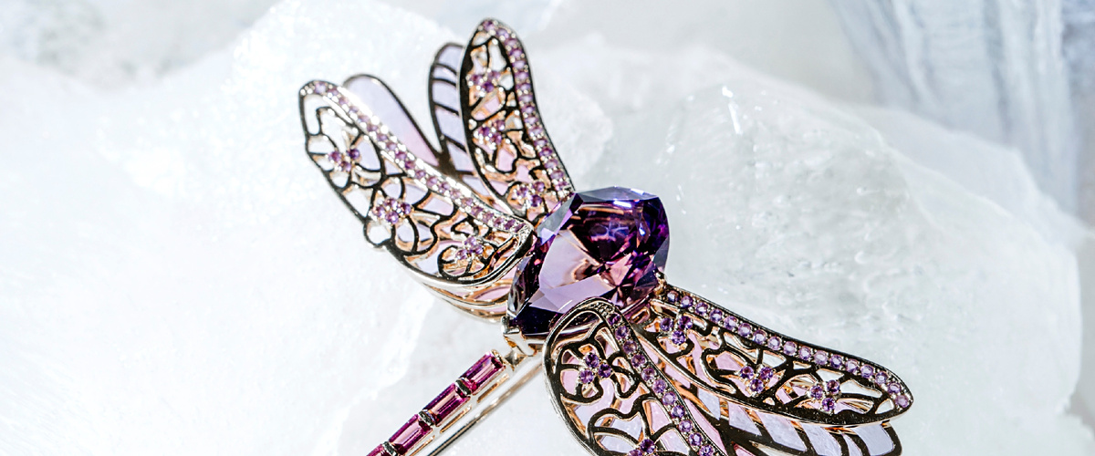 Изысканная брошь является ярким примером уникального стиля бренда, в котором каждый элемент продуман до мелочей. Ювелирный бренд Natasha Libelle, как вы знаете, не только поддерживает традиции, но и создает свои собственные. В этом году мы выпустили новогоднюю брошь-стрекозу в новом оформлении и очень надеемся, что вы сделаете ее своей семейной реликвией, своим талисманом и символом любви к прекрасному! Новая брошь украшена фиалками из аметистов на верхних крыльях, что подчеркивает индивидуальность и узнаваемость изделия. Игра света, создаваемая витражной эмалью, напоминает эффект калейдоскопа с сочетанием различных оттенков фирменного фиолетового цвета Natasha Libelle. Особое внимание стоит уделить изысканному золотому ажуру в виде цветов на крылышках стрекозы, который придает изделию легкость и воздушность. В центре броши закреплен аметист глубокого фиолетового цвета — фирменного оттенка бренда Natasha Libelle, который олицетворяет ДНК бренда. Эта брошь не просто украшение, способное