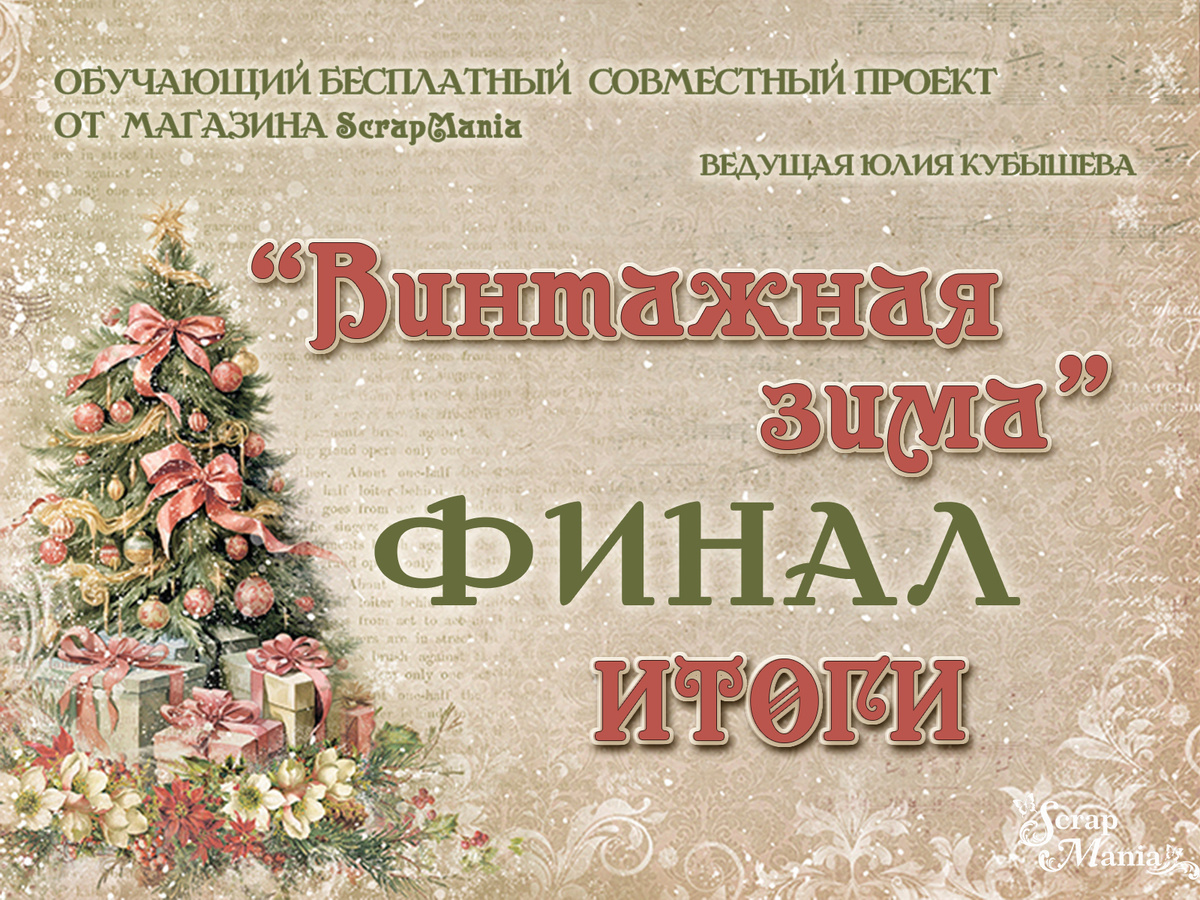 Всем прекрасного предновогоднего дня, дорогие наши читатели! Пришло время опубликовать итоги нашего традиционного новогоднего проекта по альбому "Винтажная зима"/ #SM_ВинтажнаяЗима с Кубышевой Юлией. На нашем проекте вы, вместе с нами, создали свой уютный винтажный альбом с ароматами ванили и яркими ягодками остролиста. Поздравляю всех, кто справился с поставленной задачей и дошел до финала! 💗 Дизайнеры несколько дней обсуждали, приводилы свои доводы за того или иного победителя. Сложно было выбрать, ведь практически каждый альбом был выше всяких похвал, красивые, необычные, просто бомбические! Но, к сожалению, победитель должен быть один. Мы поздравляем Ольгу Овченкову! Примите наши поздравления! И вам вручается сертификат на приобретение любых товаров в магазине "ScrapMania.ru" номиналом 1500 ру Мария, по получению приза напишите мне в ВК - вот сюда. А теперь представляем вашему вниманию ТОП-15! Девочки, мы вас поздравляем! И сейчас разыграем среди вас призы: