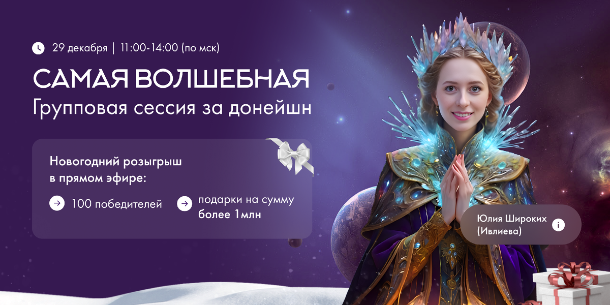 В преддверии праздника мы все суетимся: выбираем подарки, думаем о новогоднем столе, планируем, как удивить близких. Но в этом круговороте легко забыть о самом главном — своем внутреннем состоянии. А ведь то, с каким настроением мы вступим в Новый год, определяет, каким он для нас будет. 29 декабря с 11:00 до 14:00 мск я проведу особенную предновогоднюю сессию за донейшн. На встрече вы сможете освободиться от внутренних переживаний и настроиться на новый этап жизни. Вы сможете проработать свои самые сложные запросы, отпустить обиды, освободить место для радости и вдохновения. Почему я решила устроить ещё одну сессию, когда Новый год уже практически на пороге? ✨ Гармония в душе важнее нарядов и угощений. Ни оливье, ни праздничные огни не принесут счастья, если внутри накопились тревоги. ✨ Это ваша возможность завершить год в состоянии покоя и уверенности. ✨ Сессия пройдет в теплой компании единомышленников, где каждый своим присутствием создаёт мощное поле, которое поможет