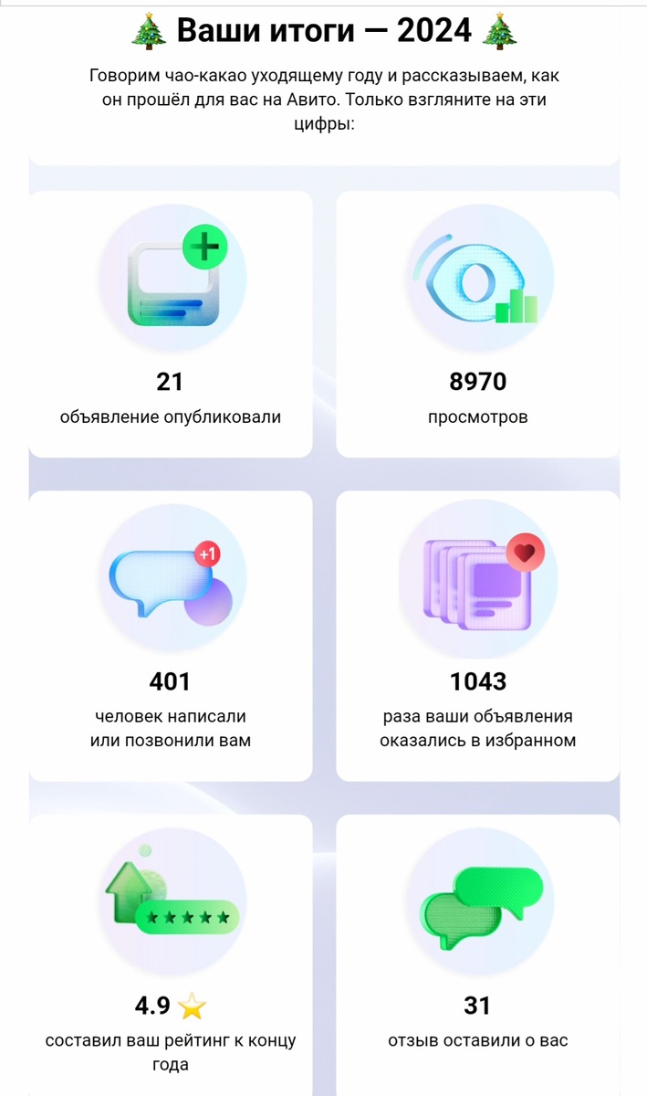 Мне на почту пришло сообщение об итогах моей работы на авито. Минусов я не нахожу. Только плюсы. Жду с нетерпением открытия нового сезона. Здесь я написала,как осваиваю авито. Сегодня я познакомилась на работе с покупательницей. Мы с ней разговорились,она тоже любительница 💐 и она мне подсказала, где в нашем городе можно купить недорогие комнатные цветы. Муж вечером за мной зехал и мы ,ну конечно же, заглянулили в этом магазин. А что я там приобрела,я вам покажу завтра. Я сегодня последний день работала. Завтра буду думать, что приготовить на праздничный стол. Придут внучка с семьёй. Ещё продукты не все закуплены. И уборка, и стирка. Дел завтра невпроворот. На этом у меня все. Хорошего дня.