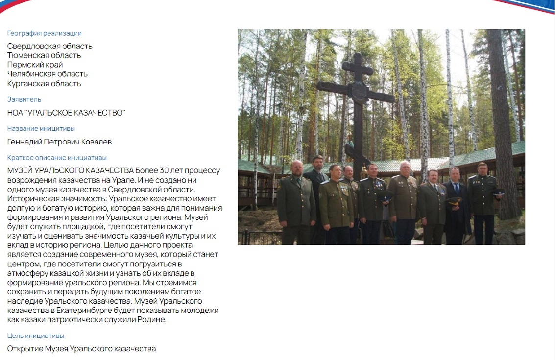 Ваш голос поможет сохранить и увековечить память о богатой истории и культуре уральского казачества. Голосуем по ссылке: sila-idey.er.ru/ Уральский регион богат историческими и культурными традициями казачества, которые тесно связаны с формированием и развитием этого региона. Однако, на данный момент уральское казачество не имеет своего собственного музея, который бы являлся информационным и образовательным центром, позволяющим посетителям исследовать и узнать больше об истории и культуре казачества в данном регионе.