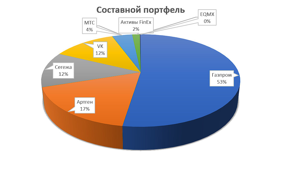 В структуре портфеля почти ничего не изменилось, не считая того, что с докупкой акций Газпрома, его доля увеличилась на 1%, а доля Артгена уменьшилась на данный процент!