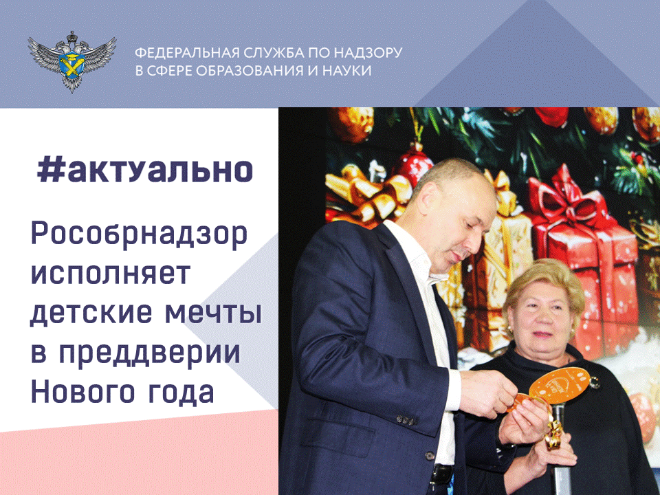 Каждый год Федеральная служба по надзору в сфере образования и науки участвует во Всероссийской акции «Ёлка желаний». В преддверии праздников руководитель Рособрнадзора Анзор Музаев снял с ёлки шарик с желанием пятилетней Алисы из города Химки, которая мечтала о музыкальном развивающем планшете. До наступления Нового года желание Алисы сбылось: руководитель Рособрнадзора Анзор Музаев и председатель Профсоюза Рособрнадзора Прасковья Смирнова исполнили заветную мечту девочки. Музыкальный планшет и сладкий подарок Алисе передали председатель Молодежного совета при Рособрнадзоре Дмитрий Сыряев и ответственное лицо за организацию работы с молодежью Елена Коневская. Мама Алисы, Ольга Владимировна, выразила благодарность: «Подарок и поздравления получили. Еще раз благодарим вас и с наступающими вас праздниками!» Всероссийская акция «Ёлка желаний» проходит с 2018 года, и каждый из нас может стать волшебником, исполнив детскую мечту. Главное – верить в чудеса!