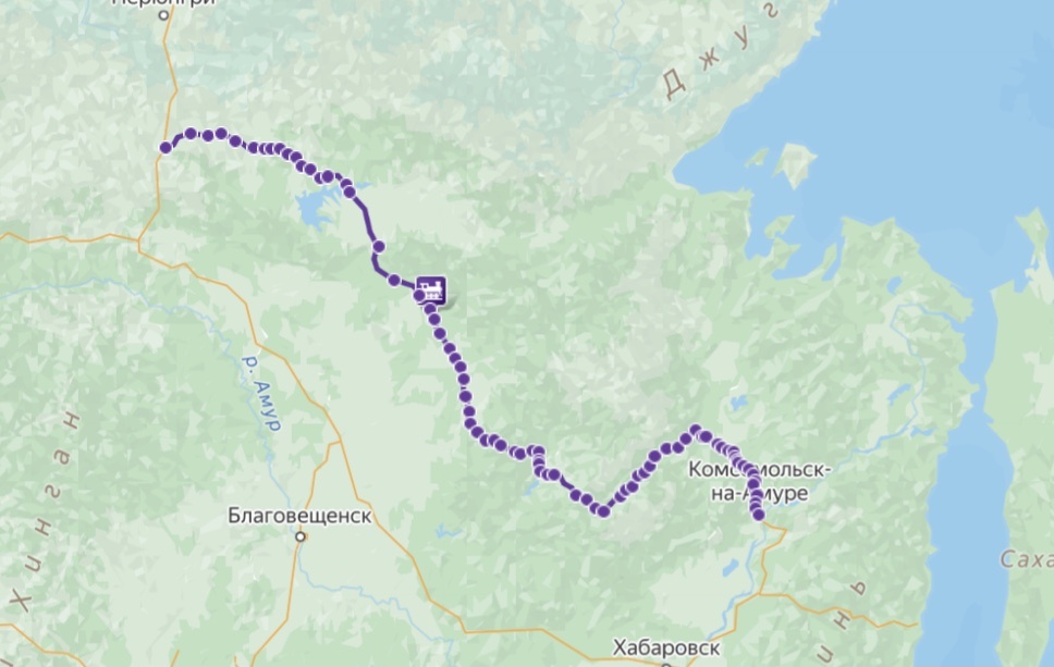Естественно, что львиную долю информации по этому направлению я выдал вчера. Только поезд тогда двигался в обратную сторону - из Комсомольска-на-Амуре в Тынду. Однако некоторые особенности у каждого из них все-таки есть. Например, у поездов № 363 и № 364 отличается время в пути. То. что время в пути в противоположные стороны одинаково - это вообще скорее нонсенс для наших железных дорог. Вот и тут оно отличается... на 2 минуты ) Такую разницу можно признать ничтожной и не принимать во внимание: В 10:42 по московскому времени и в 16:42 по местному вчера поезд № 364 отправился со станции Тында. В данный момент (около 6:30 по местному времени) поезд приближается к станции Меун. Вот он на маршруте: Первая продолжительная остановка у него была уже за полночь по местному времени. И это будет Верхнезейск (00:37, 50 минут). Это поселок, расположенный на полуострове, который достаточно глубоко вдается в Зейское водохранилище. Перед поселком и будет весьма протяженный мост через эту водную пре